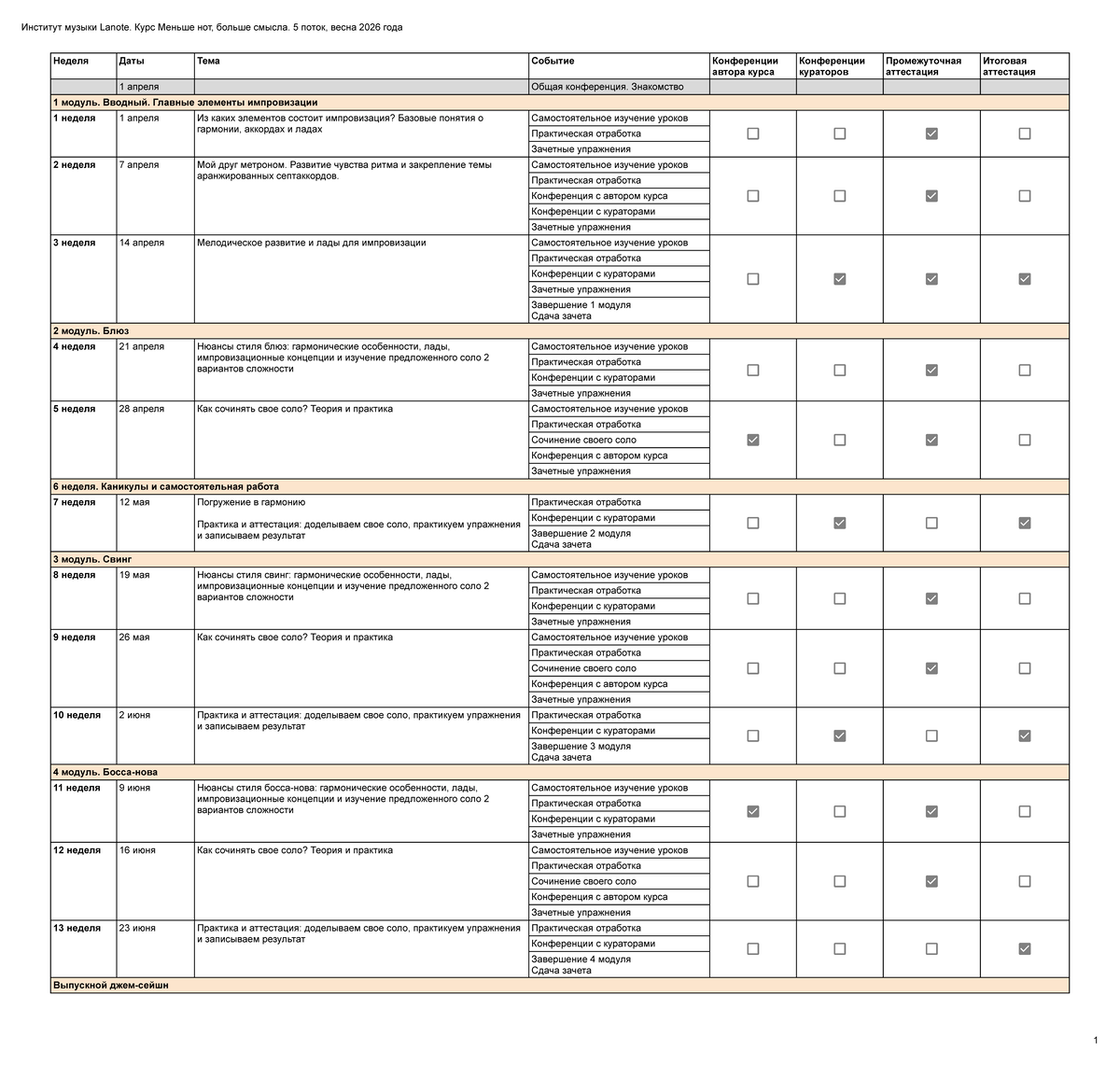 На курсе 4 основных модуля, максимально полезных для исполнителей и педагогов импровизационного искусства, джазового фортепиано и других специальностей. Каждый модуль состоит из 3 блоков.